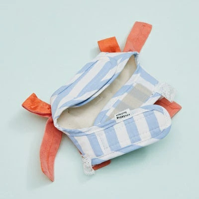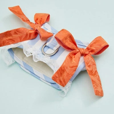 イタリア産コットンとシルクの混紡生地にクラシックなブルーのストライプをあしらったこのドレスは、鮮やかなシトラスオレンジのリボンが柔らかな光沢とロマンチックなレースのディテールが特徴で、太陽の光を浴びたリゾート気分を漂わせます。