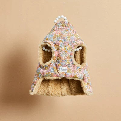 柔らかなゴールドのエコファー裏地が温かさと快適さをプラスし、繊細なプリントがイングリッシュガーデンの優雅さを思わせます。