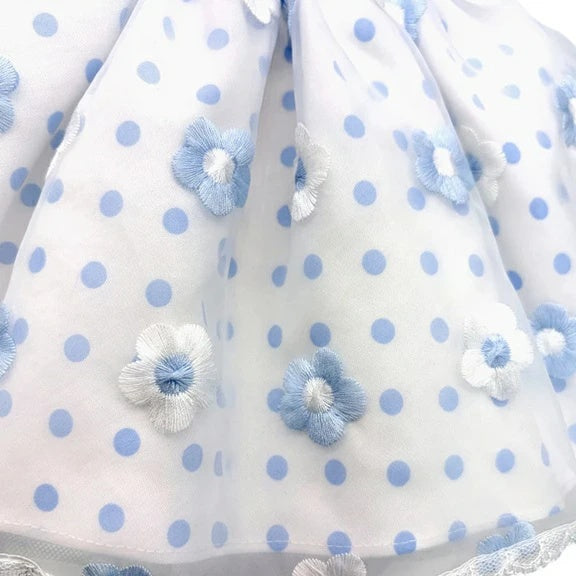 水玉柄の生地に、花柄刺繍を施したオーガンジーを重ねた二層構造。重なり合う素材が奥行きを生み、上質な立体感を宿します。