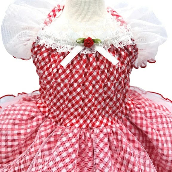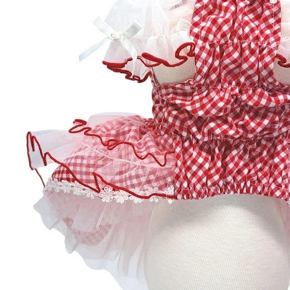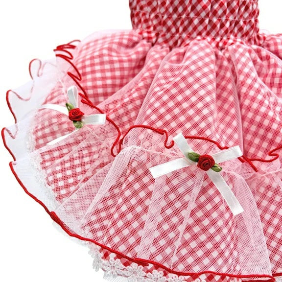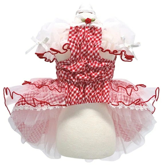 可憐なレッドギンガムに透け感あるチュールを重ね、存在感を宿しながらも上品に佇みます。