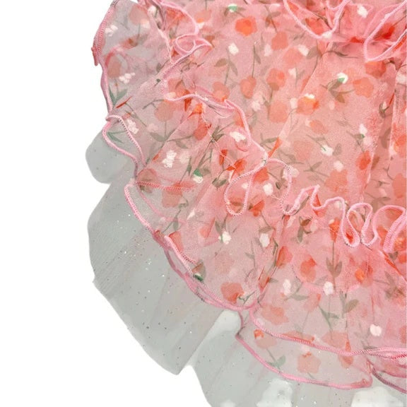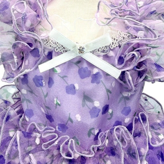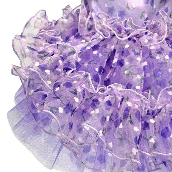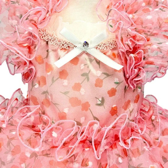全体にあしらわれたフリルが動きに合わせて柔らかに揺れ、空気を纏うような立体感を演出。広がりのあるシルエットが可憐さを宿します。