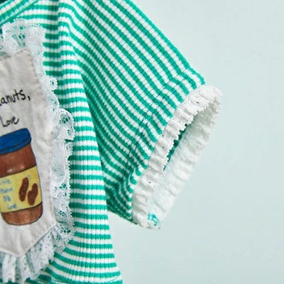 鮮やかなグリーンストライプに、ユーモラスなピーナッツバターのグラフィックパッチを添えて。